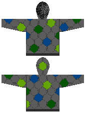 Detta är en mycket enkel variation på den fackverksstickningen som presenterades i "Takläggaren". Detta mönster får det att se ut som att man bär en grå tröja med hål i ovanpå en gul tröja - eller möjligen en slät grå tröja med påsydda applikationer. Modellen kan eventuellt förses med samma huva som "Takläggaren".
